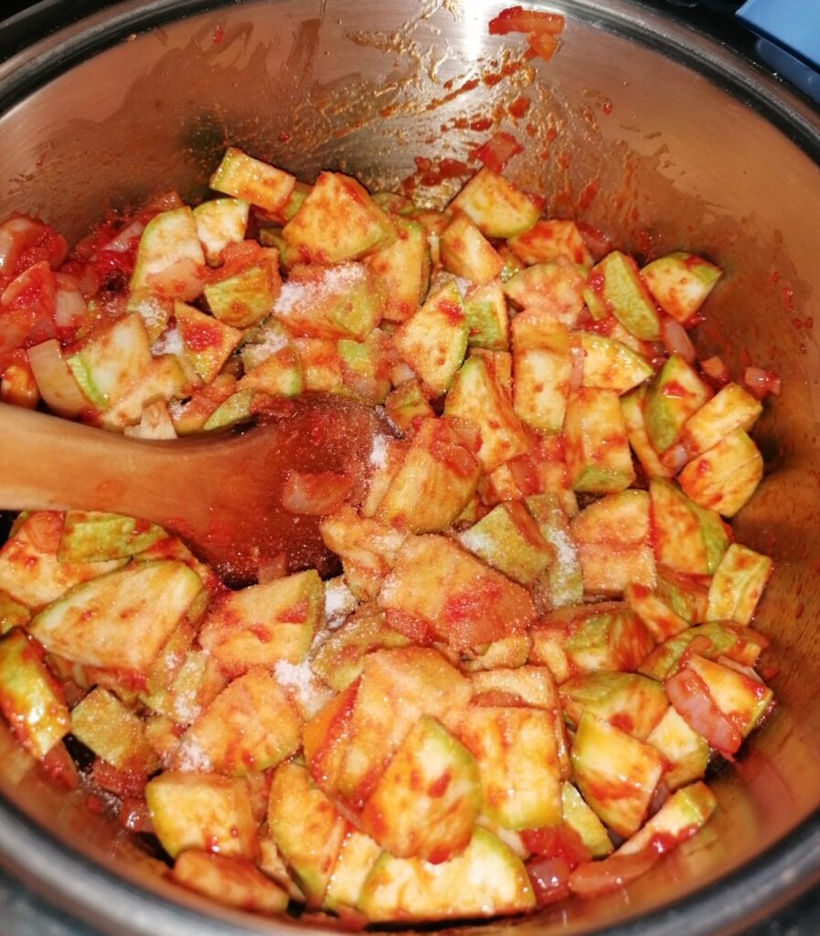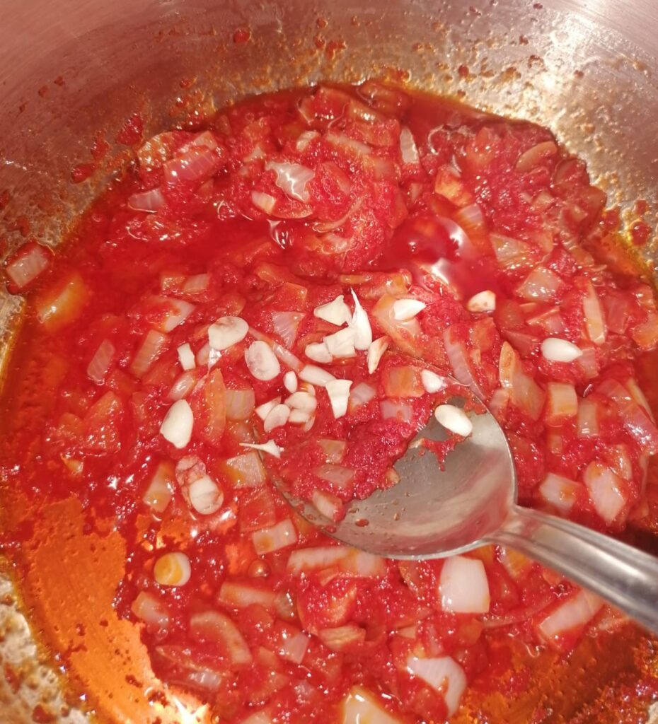 Hazırlanışı: Tencereye doğradığımız soğanı katıp pembeleşinceye kadar kavuruyoruz sonra domates salçasını ekliyoruz biraz kavrulunca sarımsağı doğrayıp ekliyoruz.